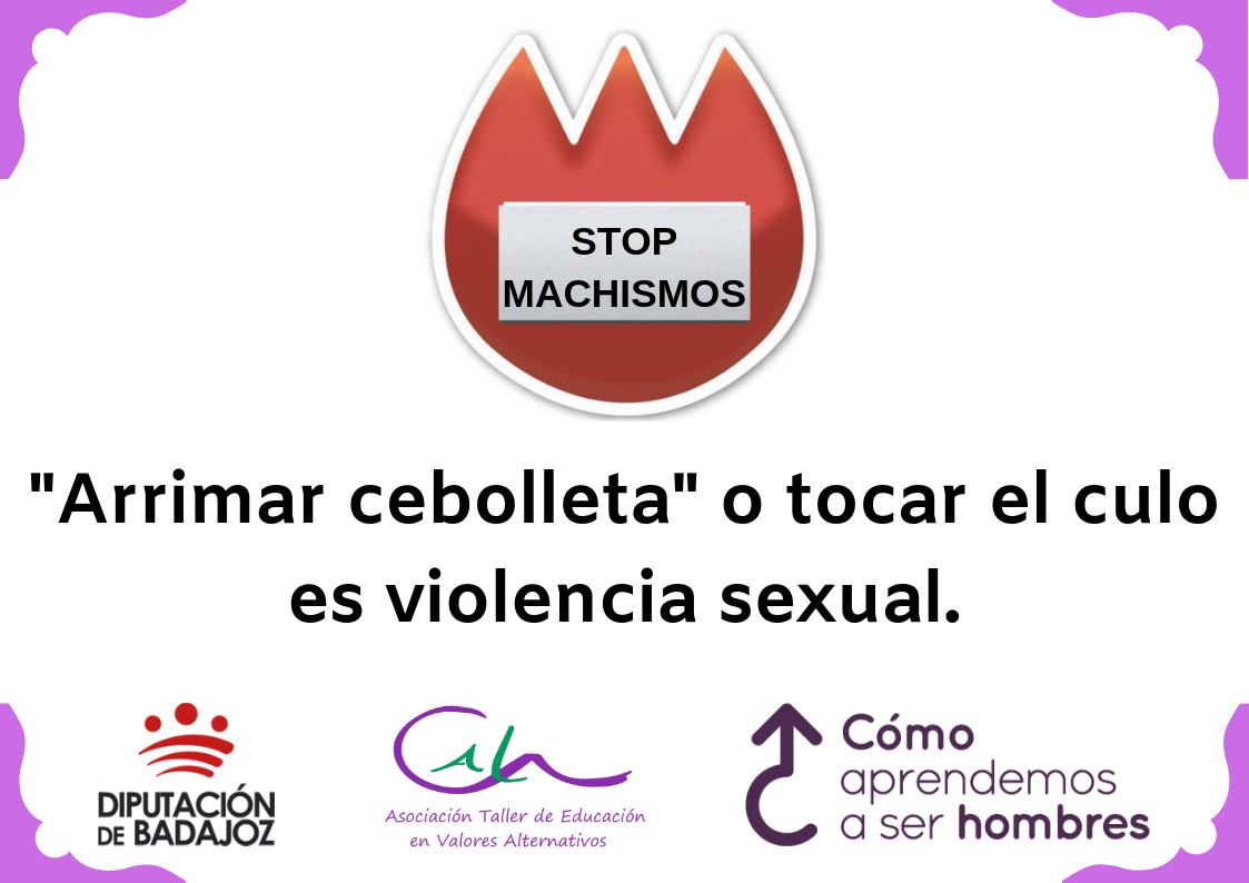 Carteles en los que aparece un símbolo que ya venimos usando en una campaña anterior en redes sociales, y en la que añadimos preguntas o afirmaciones que hagan reflexionar a los hombres que están en esos espacios. Nos dirigimos especialmente a los hombres, porque nuestra campaña proviene del proyecto ¿Cómo aprendemos a ser hombres? financiado por la Diputación de Badajoz, en el que interpelamos directamente a los hombres ya que sino somos la solución seremos parte del problema.