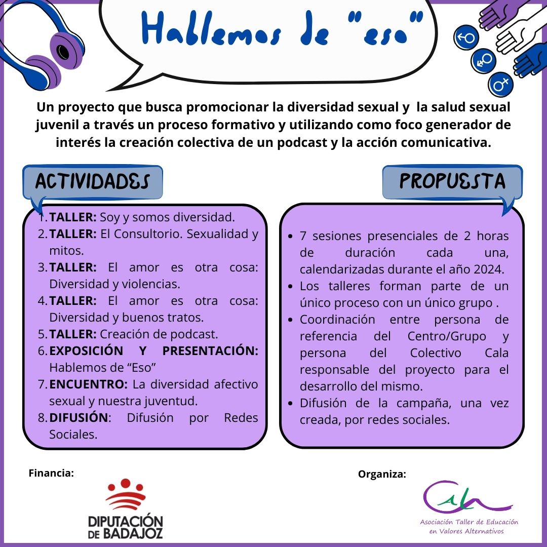 Esta primera semana de julio, justo dos semanas después de haber terminado las clases comenzamos, “Hablemos de eso. Jóvenes y Diversidad” un proyecto para el que contamos con la financiación de la Diputación de Badajoz y que está enfocado al trabajo en la igualdad, en la salud, en el placer y en el respeto a todas las personas y a toda la diversidad que es inherente a la humanidad.