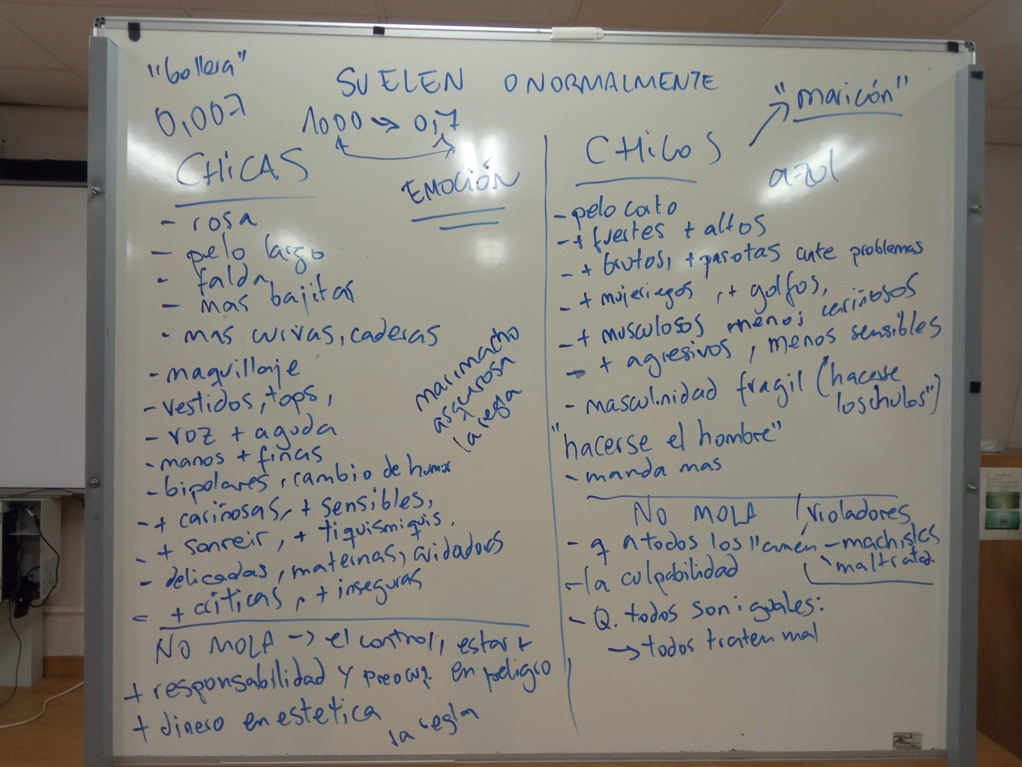 En esta primera sesión hemos presentado el proyecto y las actividades, con la intención de revisarlas y ajustarlas al grupo, a través de juegos de conocimiento y de clima; y hemos realizado una breve aproximación a qué es ESO de la diversidad sexual, a través de preguntas como: ¿Qué es o qué significa ser chico o/y chica? ¿Cómo son las identidades no binarias? ¿Cómo nos afecta la socialización de género? ¿Cómo funcionan los mandatos de género? ¿Qué significa la diversidad de las identidades?