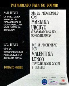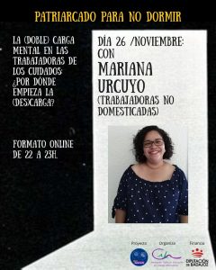 - Este mes de noviembre, el jueves 26, de 22h a 23h, tendremos como tema «la (doble) carga mental en las trabajadoras de los cuidados: ¿por dónde empieza la (des)carga?»