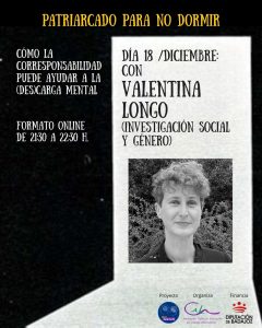- En el mes de diciembre, el jueves 18 de 21:30 a 22:30 hablaremos sobre «Cómo la corresponsabilidad puede ayudar a la (des)carga mental» de la mano de Valentina Longo. Forma parte de CEPAIM y es creadora del podcast Sangre Fucsia. Es socióloga e investigadora de género, desarrolla proyectos de investigación social cualitativa, centrándose en la justicia de género, el trabajo de cuidados, las masculinidades, la migración y las dimensiones emocionales del trabajo.
