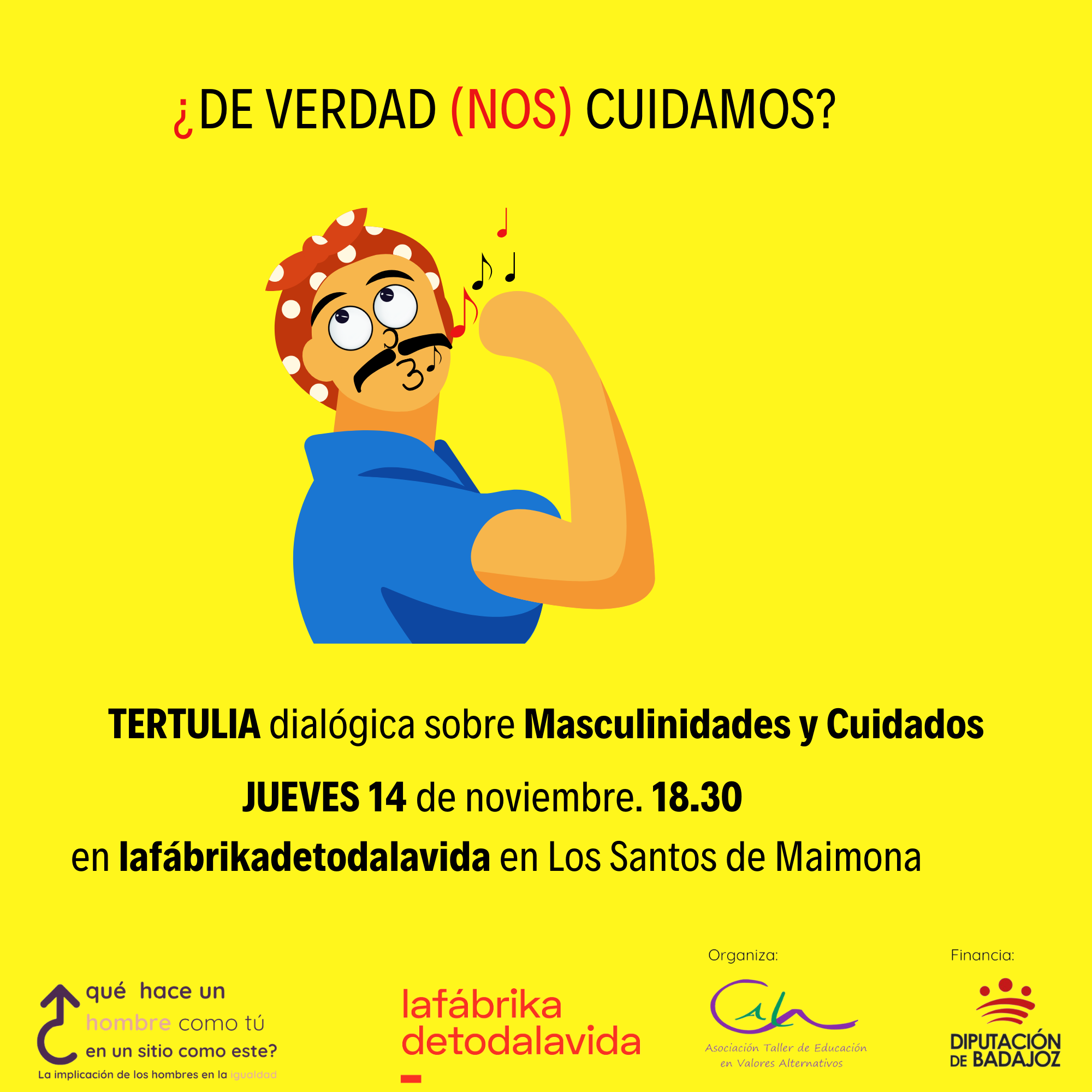 Dentro del proyecto «¿Qué hace un hombre como tú en un sitio como éste?» financiado por Diputación de Badajoz vamos a realizar dos tertulias dialógicas en dos sitios referentes en Extremadura. Por una parte, estaremos el viernes 8 de noviembre a las 19.00 en El Lokalino en Montijo para hablar de Masculinidades: El papel de los hombres y corresponsabilidad. Por otra parte, el jueves 14 de noviembre a las 18.30 en Lafabrikadetodalavida en Los Santos de Maimona organizamos la tertulia «¿De verdad (nos) cuidamos?. Masculinidades y cuidados».